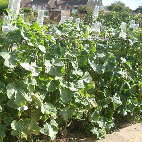 Plant outside cukes on a ridge and greenhouse plants next to a buried watering bottle. Remember to provide them with a frame to grow on.
