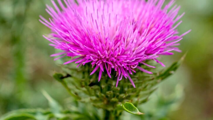 Musk thistle grows two to six feet tall with occasionally branching, sometimes hairy stems. The densely lobed leaves have a pale midrib and spiny margins, and their bases form narrow wings on the stem. Green, purple, or golden bracts form layered rays behind the spherical, pink to purple flowers.