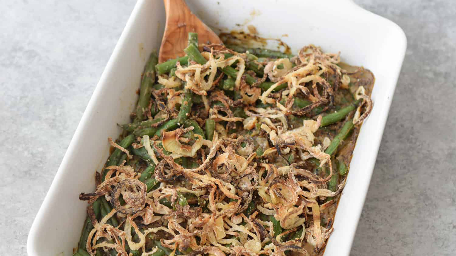 This version uses fresh green beans, a homemade creamy mushroom soup, and baked, crispy onions on top. Or, throw the onions in the air fryer for an extra-crispy version, more like the traditional store-bought onions.