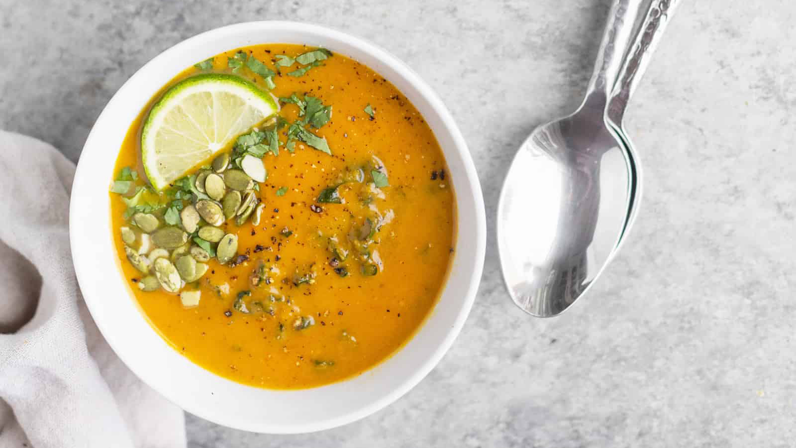 Enjoying soup as a first course is a great way to fill up, especially with this spicy pumpkin soup, which has 5 g of fiber per serving. Made with canned pumpkin, coconut milk, and kale, this veggie-packed soup is a flavorful way to sneak in extra vegetables.